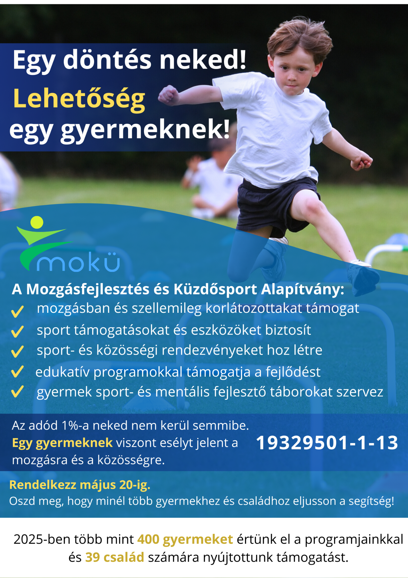 A MOKÜ Alapítvány azért dolgozik, hogy rászoruló gyermekek és családok valódi támogatást kapjanak – legyen szó mozgásfejlesztésről, sporttámogatásról vagy speciális eszközök biztosításáról.